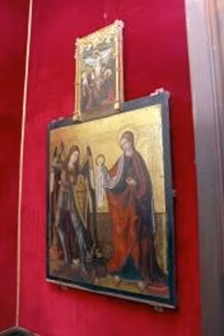 Este retablo medieval puede atribuirse al Maestro de Xàtiva por las líneas dulces de las caras de los santos, con una marcada forma ovalada.
