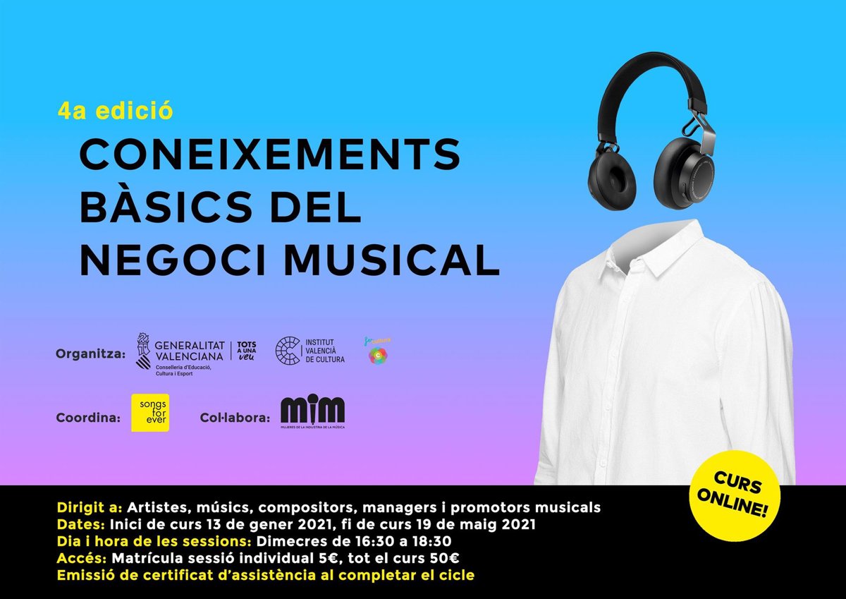 El Institut Valenci de Cultura (IVC) ofrecerá a partir del próximo 13 de enero de 2021 la cuarta edición del ciclo formativo 'Conocimientos básicos del negocio musical', dirigido a profesionales de la música, artistas, promotores, programadores, mánagers y agentes culturales.
