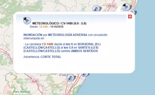 La CV-1486, en El Bolseral (Castellón), permanece este jueves cortada por las lluvias, según ha informado la Dirección General de Tráfico (DGT).