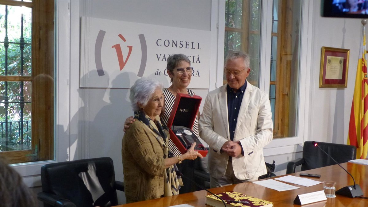 La presidenta en funciones del CVC, Dolors Pedrós (centro), en la entrega de la Medalla de Honor de la entidad a la actriz valenciana Teresa Lozano. - CVC