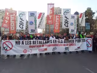 Durante la manifestación, los asistentes han coreado insistentemente lemas como 'no a les retallades' ('no a los recortes') y han pedido también la dimisión del conseller de Hacienda y Administraciones Públicas, José Manuel Vela, y de la delegada del Gobierno en la Comunitat Valenciana, Paula Sánchez de León.