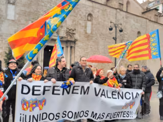 La concentración se ha llevado a cabo durante alrededor de una hora en la plaza de San Agustín de València, donde los participantes han ondeado banderas de España y han coreado gritos como 'Soc valencià, no catalá', 'España es una y no 51' o 'Volem un alcalde que siga valencià', bajo una pancarta central con el lema 'Unidos somos más fuertes'.