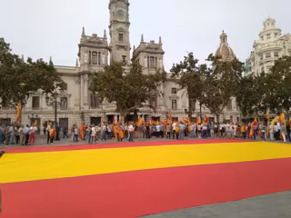 Una concentración secundada por decenas de personas ha desplegado este domingo una bandera gigante en el centro de la plaza del Ayuntamiento de València, a modo de gesto a favor de la unidad de España y para "luchar contra el separatismo y la independencia" en la jornada del referéndum en Catalunya.