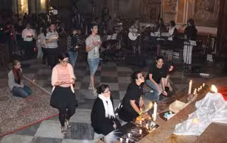 Además, se elige una iglesia céntrica de la ciudad con afluencia de gente y a su entrada los voluntarios se encargan de regalar velas a la gente que pasa por la calle y se les invita a encenderlas ante el altar y a participar en esta experiencia.