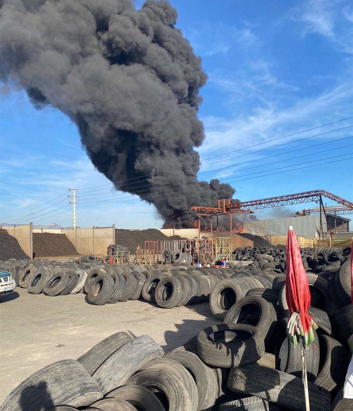 En concreto, el incendio, que se ha iniciado sobre las 15.15 horas, afecta a un solar de la fábrica donde se almacenaban ruedas troceadas para su reciclaje, según han informado desde el Centro de Coordinación de Emergencias de la Generalitat, el Consorcio Provincial de Bomberos de Alicante y la Policía Local de Aspe.
