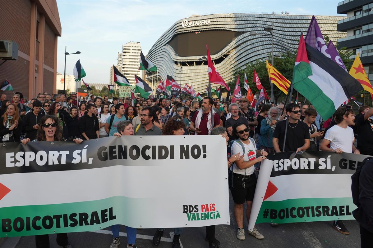 Archivo - Decenas de personas durante las movilizaciones por la celebración del partido de baloncesto entre el Valencia Basket y el Hapoel Tel Aviv israelí, frente al Roig Arena, a 16 de octubre de 2025. ARCHIVO. - Eduardo Manzana - Europa Press - Archivo
