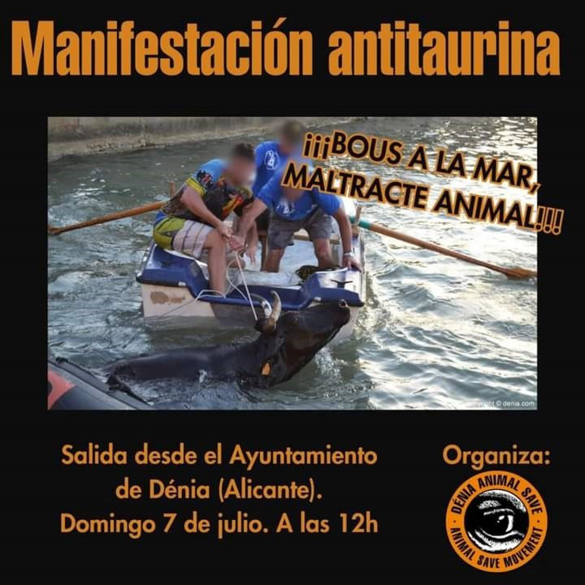 Dénia Animal Save ha organizado una manifestación el domingo 7 de julio para mostrar su rechazo a los eventos de 'Bous a la mar' que tendrán lugar en la localidad alicantina de Dénia. El recorrido comenzará a las 12.00 horas a las puertas del Ayuntamiento de Dénia.