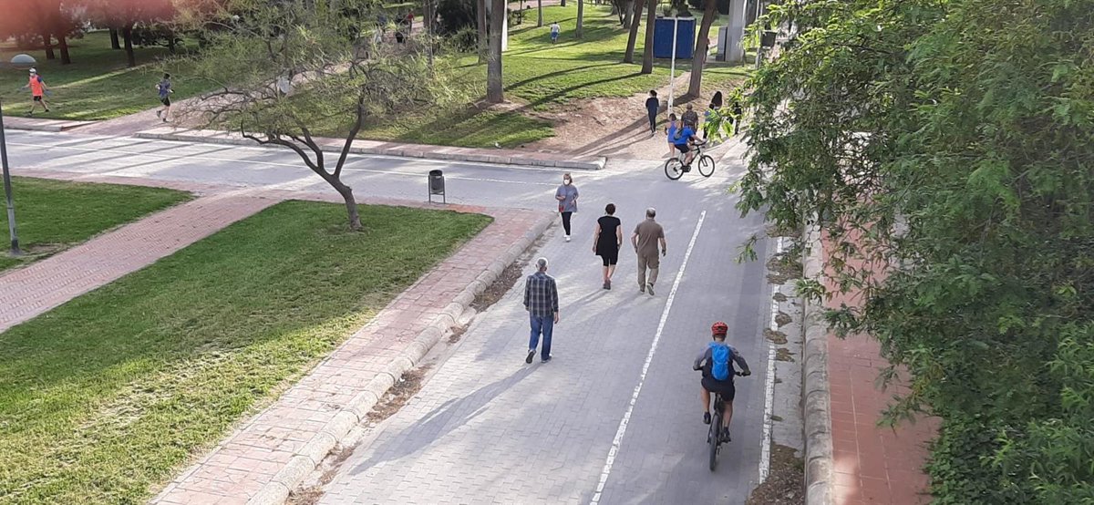 Las calles y zonas verdes de la ciudad de Valncia han vuelto a acoger durante la madrugada de este sábado actividades deportivas y paseos y han recibido a ciclistas, corredores y caminantes por primera vez desde que se decretó el estado de alarma por coronavirus.