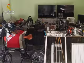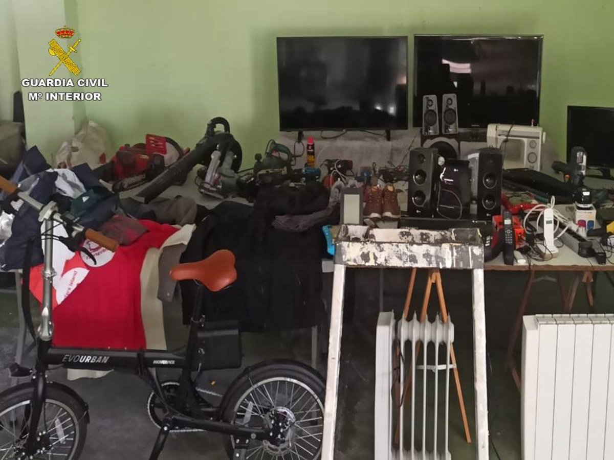 En dos registros domiciliarios posteriores se intervinieron varios televisores, gran cantidad de herramientas, un patinete, una bicicleta eléctrica, radiadores, electrodomésticos, máquinas de coser, zapatillas, radiocasetes, aspiradoras, teléfonos y una gorra de la Guardia Civil.