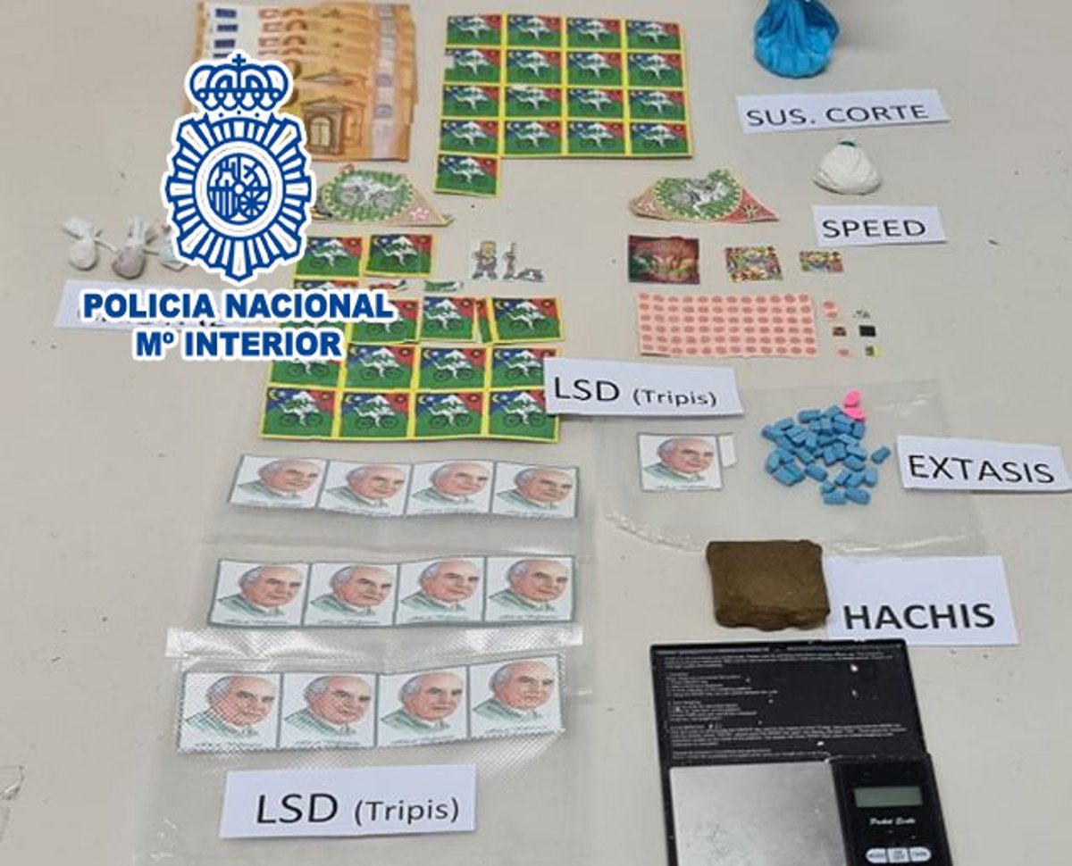 Finalmente, los agentes detuvieron a los investigados y realizaron un registro voluntario en su domicilio, donde hallaron e intervinieron 21 gramos de sulfato de anfetamina (speed), 50 gramos de hachís, 328 dosis de dietilamida de ácido lisérgico (LSD) impregnadas en sellos y conocidas popularmente como 'tripis', con la efigie del químico suizo y Albert Hofmann (primer científico en sintetizar el LSD), 300 euros en efectivo, así como diversos útiles destinados a la dosificación para la venta de estas sustancias estupefacientes.