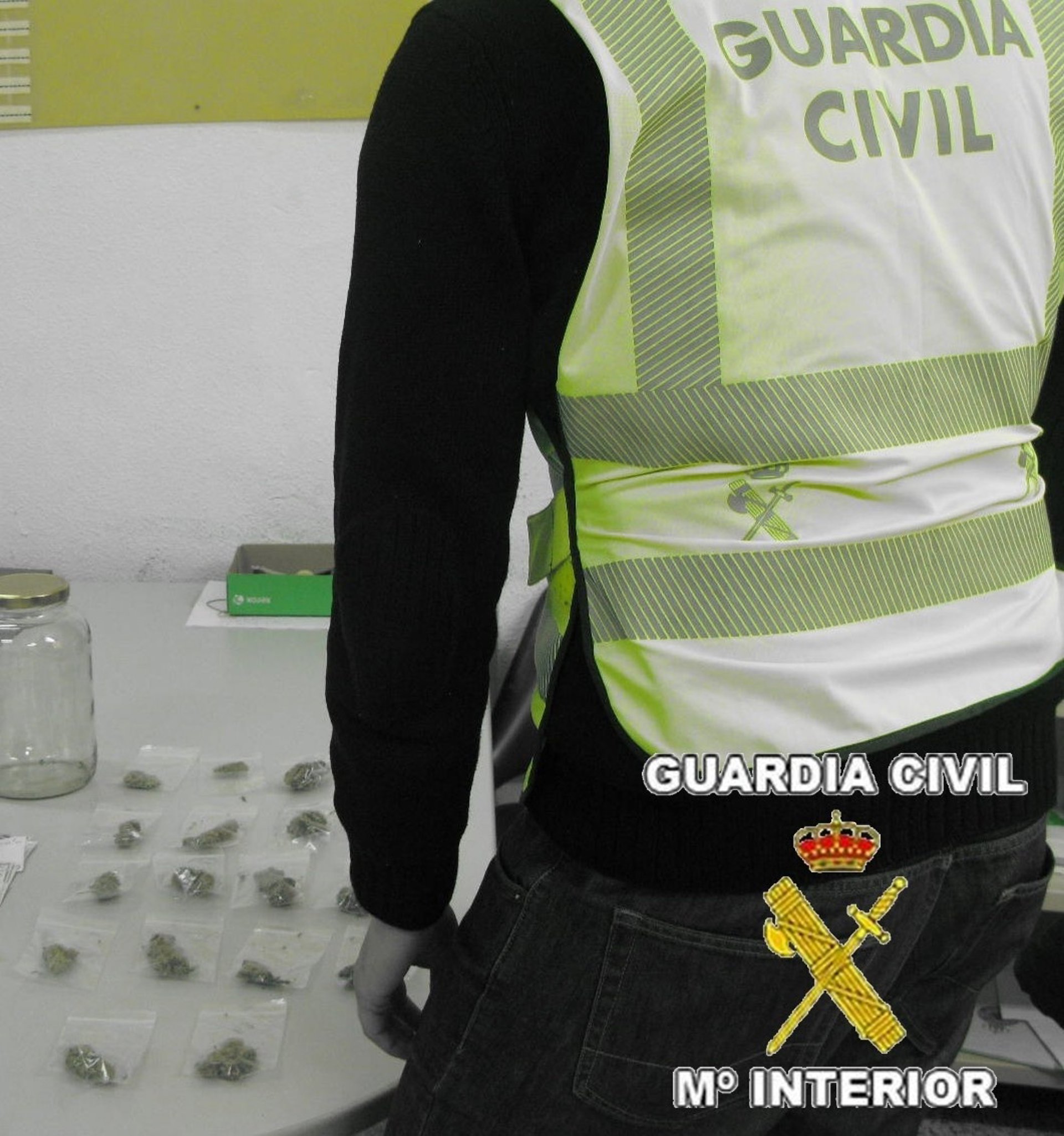 Tras una persecución, los guardias civiles alcanzaron al varón y recuperaron la bolsa que había tirado, que contenía un bote de cristal con 17 bolsitas con tres gramos de marihuana cada una, unas tijeras y cajas de pequeño tamaño para la conservación de la sustancia, así como 70 euros fraccionados en billetes de 20 y de 10.