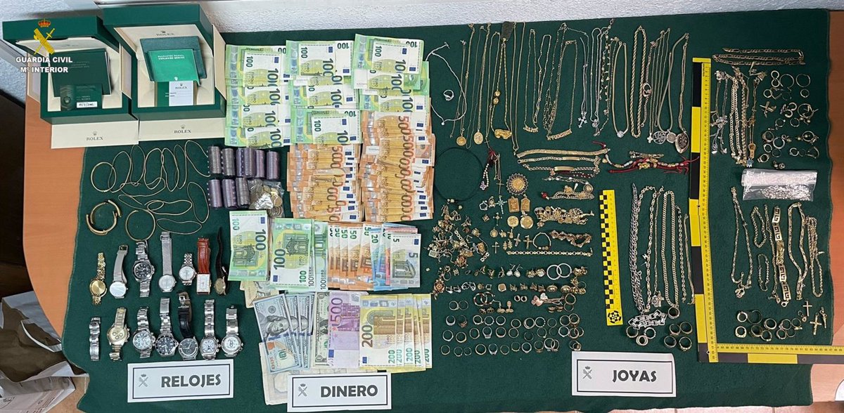 En los registros se ha encontrado joyas y relojes por un valor de 900.000 euros, walkie-talkie, placas de matrículas falsas y documentación personal falsificada y cinco vehículos con un valor de 50.000 euros. Además, se hallaron diversos objetos como herramientas de alta gama, compresores, grupos electrógenos, equipamiento deportivo, bicicletas, patinetes, videoconsolas, catalizadores, detectores de metales, un quads y todo valorado en más de 150.000 euros. Por último, se encontraron más de 50.000 euros en efectivo.