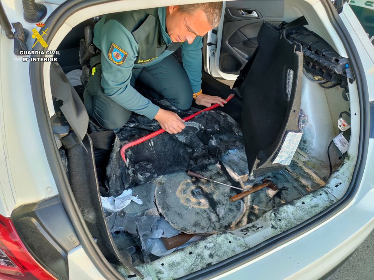 Así, comprobaron que el interior del maletero del vehículo se encontraba lleno de una serie de cajas con objetos relacionados con el ámbito de la hostelería y que debajo de ellas que el fondo había sido modificado de forma artesanal obteniendo un hueco estanco.
