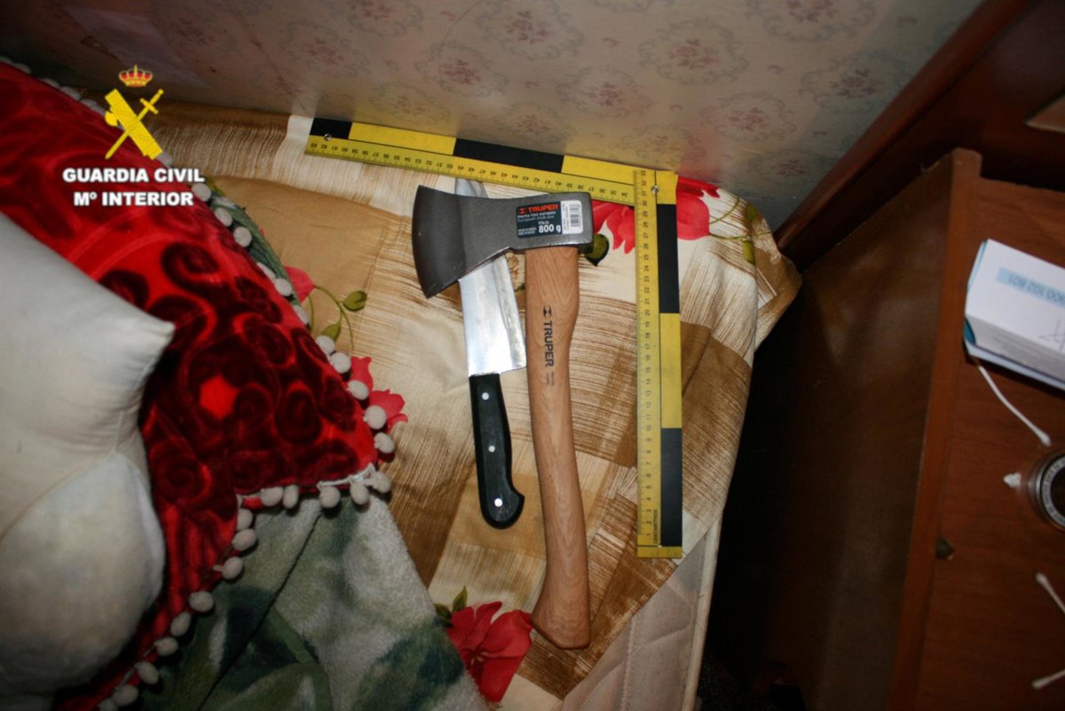 La Guardia Civil efectuó un registro domiciliario debidamente autorizado en la vivienda del supuesto agresor, donde se intervinieron un cuchillo de cocina de grandes dimensiones y un hacha con el astil de madera, ambos supuestamente implicados en los hechos delictivos. Las diligencias instruidas junto con el detenido han sido entregadas en los Juzgados de Nules en funciones de guardia. Ha sido decretado el ingreso en prisión del detenido.
