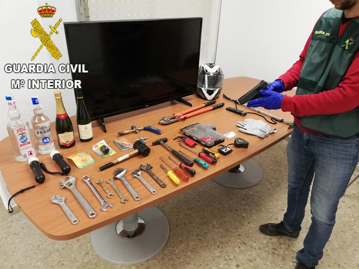 En el registro se intervienen numerosos objetos relacionados con los robos que se investigan, siendo de reseñar una pistola simulada, una televisión, dos mandos de Play Station, herramientas varias y dos décimos de lotería que se relacionan en diligencias.