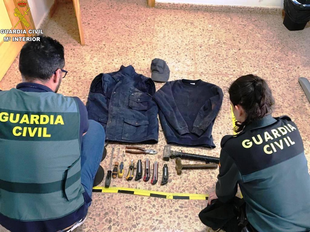 Tras realizar la inspección ocular del vehículo, los agentes han hallado evidencias utilizadas para la comisión del delito, tales como herramientas y ropa de la que utilizan los operarios con la intención de pasar desapercibido y dificultar la acción policial.
