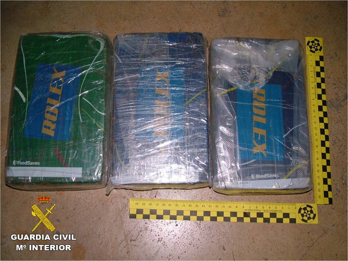 Debajo de un asiento del turismo, la Guardia civil localizó tres paquetes de igual tamaño, envueltos en plástico, que aparentemente podían contener alguna sustancia estupefaciente. El test de narcóticos indicó que se trataba de 3,5 kilos de cocaína.
