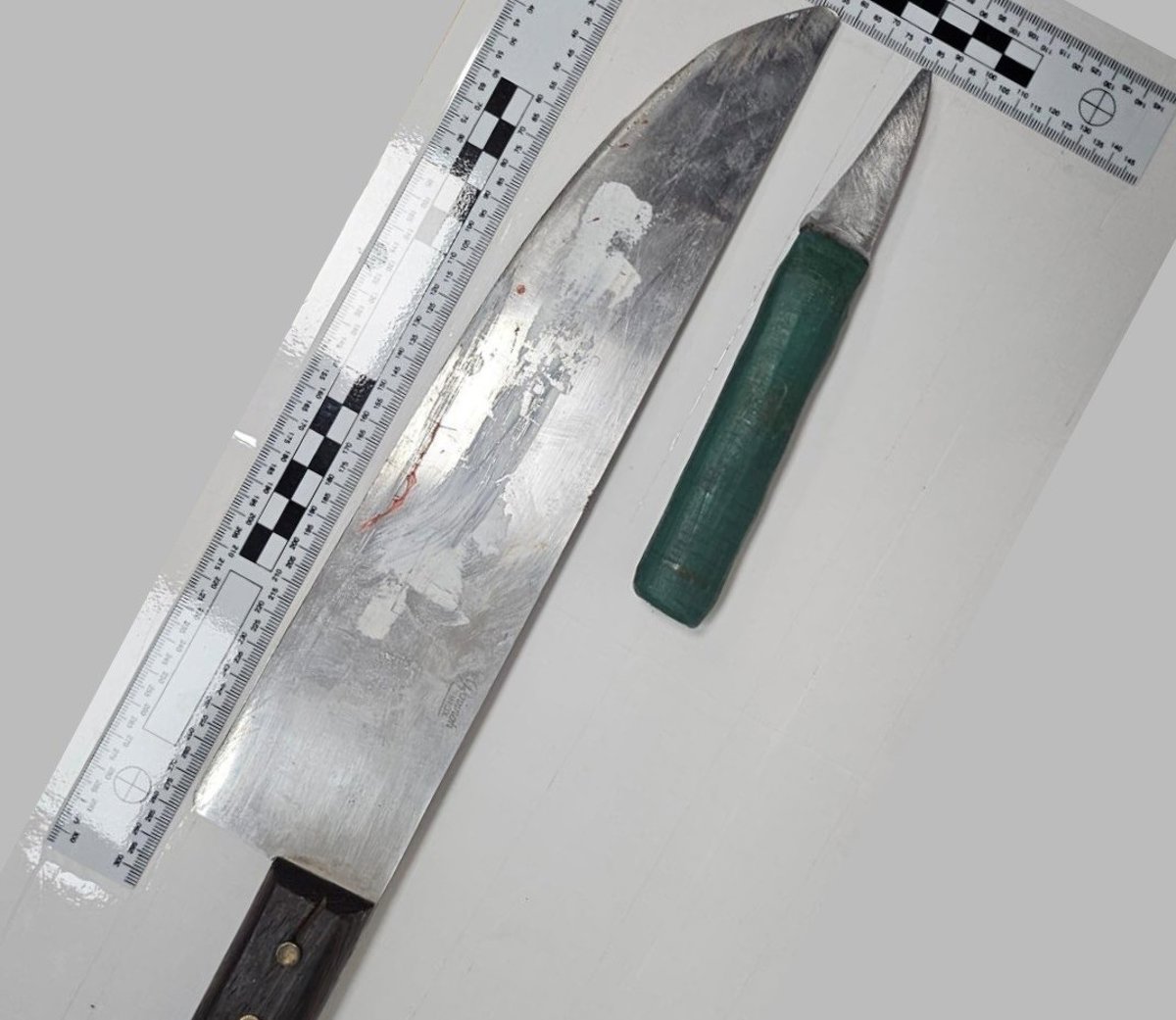 Durante la intervención, los agentes localizaron un cuchillo de aproximadamente 27,5 centímetros de hoja y mango de madera, con restos de sangre, oculto bajo un vehículo estacionado a escasos metros del lugar de la detención. Asimismo, en el registro superficial del detenido se intervino un segundo cuchillo, de unos seis centímetros de hoja y mango de plástico verde.