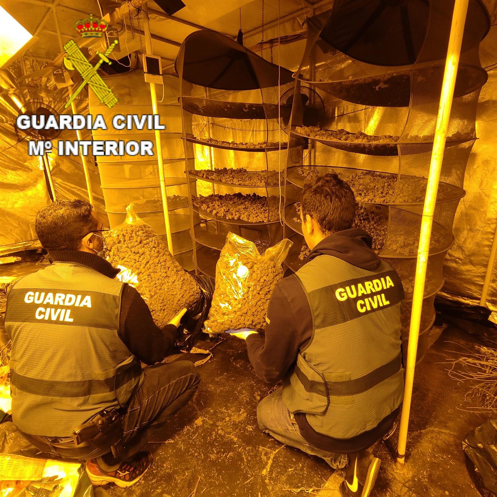 En total, la Guardia Civil ha incautado 25.000 gramos de cogollos secos de marihuana, así como diferentes efectos utilizados para el desarrollo y crecimiento de las plantas, entre ellos cuatro aires acondicionados, 101 balastros de potencia, cinco extractores, 28 ventiladores, 72 lámparas y portalámparas de cultivo y ocho estufas de calor. Además, han comprobado que el garaje-almacén presentaba un enganche ilegal a la red eléctrica.