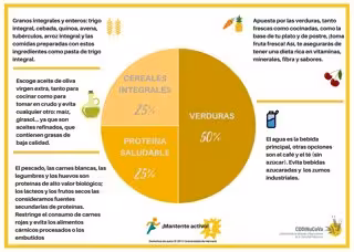 Para conseguir una correcta alimentación, las comidas deben estar pensadas de antemano. Así se deja menos espacio a la improvisación y a los alimentos de consumo rápido, como los ultraprocesados, y se puede idear una dieta equilibrada y completa nutricionalmente. Lo más aconsejable es priorizar platos que incluyan verduras y hortalizas, alimentos proteicos y ricos en hidratos de carbono como los cereales, las legumbres o los tubérculos, teniendo siempre presente la estructura de plato saludable que nos propone el plato de Harvard. Por ejemplo, una ensalada a base de pasta, patata o arroz que incluya vegetales y otros componentes proteicos y que se puede transportar en un tupper y una neverita fácilmente.