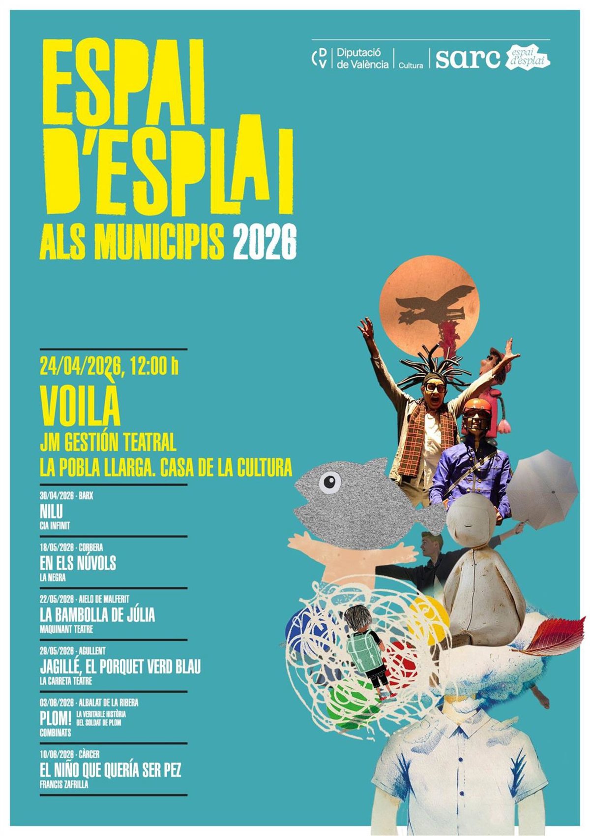 Desde este viernes 24 de abril, hasta el próximo 10 de junio, la Diputación va a llevar a siete municipios de menos de 5.000 habitantes diferentes espectáculos teatrales. Espai d'Esplai arranca este viernes en la Casa de la Cultura de La Pobla Llarga con el espectáculo 'Voilà'. Todos los pases del programa están dirigidos a público escolar de entre 3 y 12 años, ha informado la corporación provincial en un comunicado.