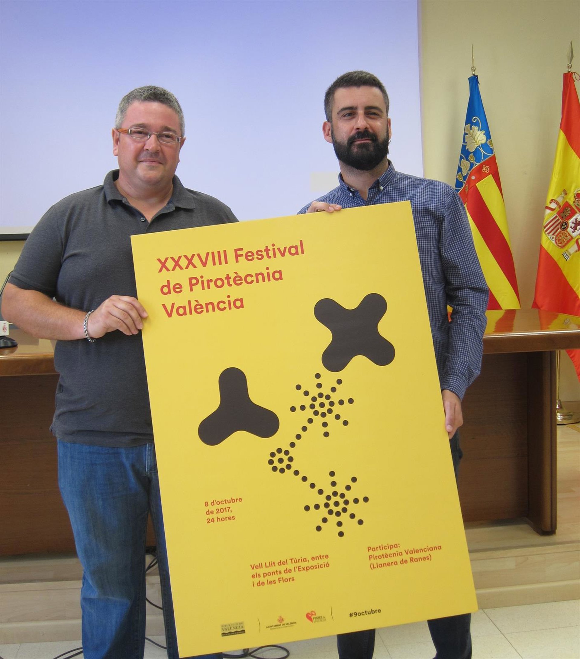 El concejal de Cultura Festiva, Pere Fuset, y el responsable de Pirotecnia Valenciana, José Manuel Crespo, han presentado este viernes en rueda de prensa el certamen y el cartel anunciador, que ha sido realizado por el artista plástico Ibán Ramón. El castillo tendrá lugar a medianoche en el viejo cauce del Turia, entre el Puente de la Exposición y el de las Flores.