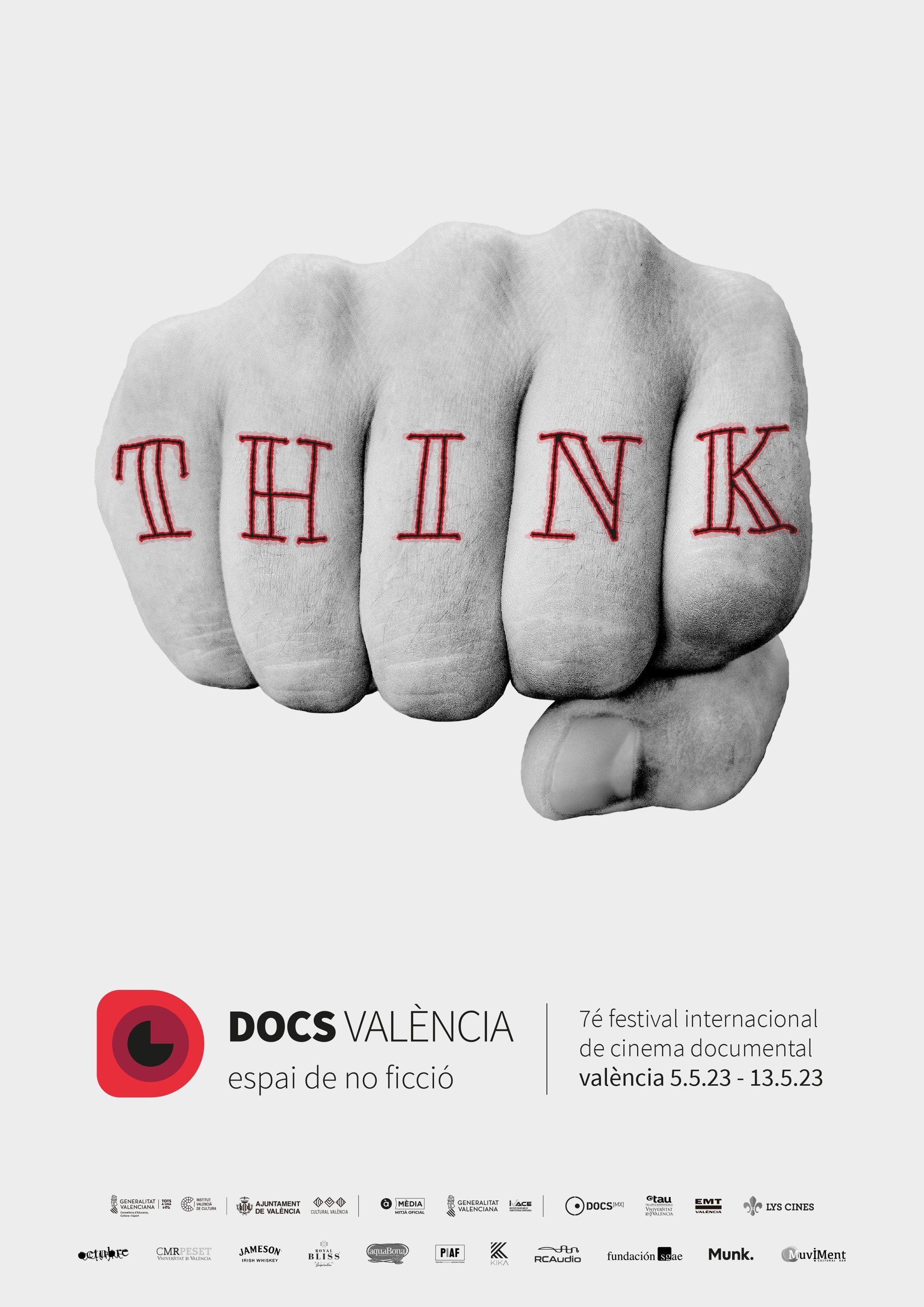 Desde su primer año, DocsValncia ha contado con Kike Correcher a la hora de diseñar el cartel. Con el uso de una sola palabra en las últimas tres ediciones, el festival ha logrado transmitir mensajes potentes y profundos sobre el cine documental y su papel en nuestra sociedad. Este año, el uso de la palabra 'THINK' cierra una trilogía que Correcher inició en 2021 con 'OPEN' y continuó en la edición anterior con 'REAL'. Cada una de estas palabras ha sido cuidadosamente elegida para crear una reflexión visual sobre el cine de no ficción y su relación con la realidad que nos rodea.