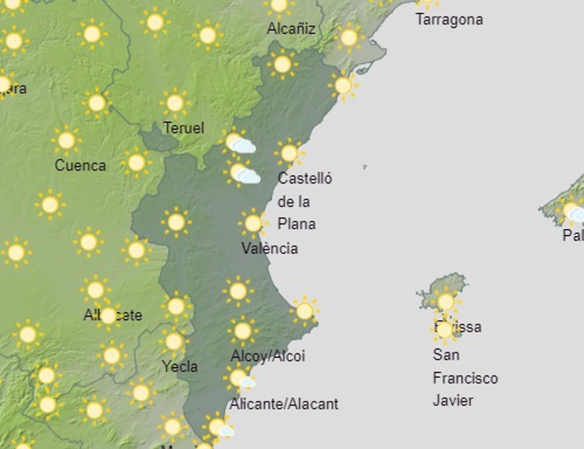 Finalmente, en Alicante, se esperan máximas de 34 en Orihuela, 32 en Alcoi y Elx, 31 en Dénia y 30 en Alicante. Las mínimas serán de 19 en Alcoi, 21 en Elx, Orihuela y Dénia, y 22 en Alicante.