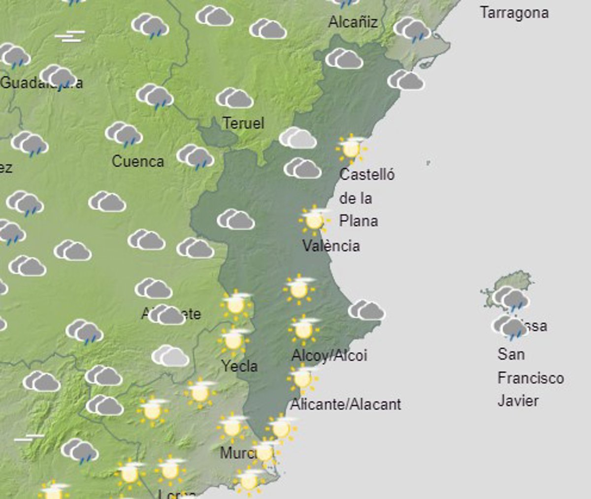 Durante la primera mitad del día, se esperan cielos nubosos con precipitaciones débiles en el tercio norte. Soplará un viento moderado del suroeste, con rachas muy fuertes en el interior de Valencia y de Alicante, que podrían extenderse a puntos del litoral de Alicante o interior sur de Castellón, según la predicción de la Agencia Estatal de Meteorología (Aemet).