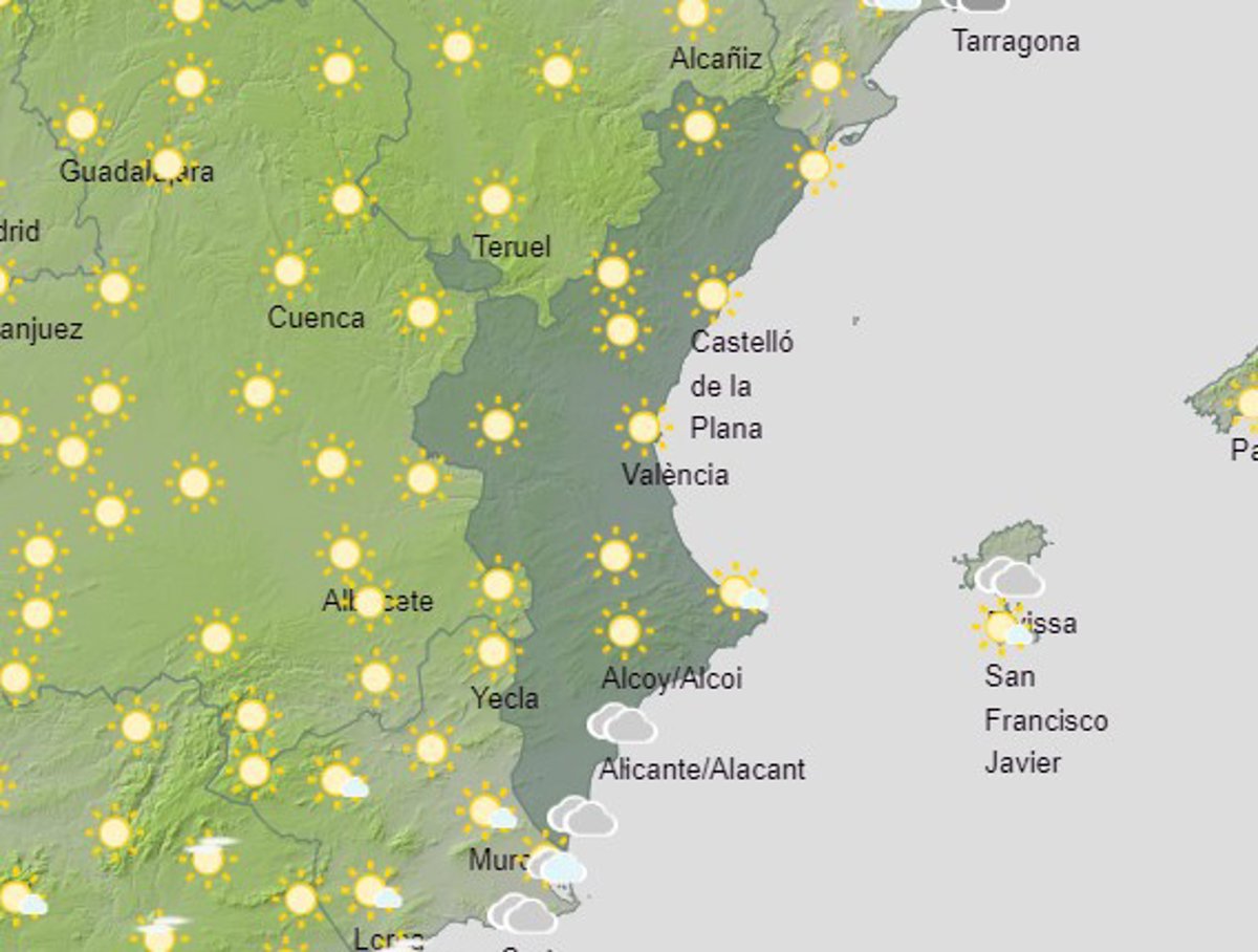 Finalmente, en Alicante, se esperan máximas de 21º en Orihuela, Elche y Alcoi y 20º en Alicante y Dénia. Las mínimas serán de 7º en Alcoi, 11º en Orihuela, Elche y Dénia, y 13º en Alicante.