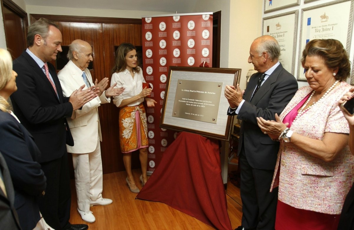 La Princesa de Asturias ha llegado a la sede de la Fundación, donde se celebra la jornada 'Enfermedades raras. El ciclo de la urea y sus patologías', minutos antes de las 12.00 horas y se ha sentado entre los asistentes, en la primera fila, junto al presidente de la Generalitat valenciana, Alberto Fabra.