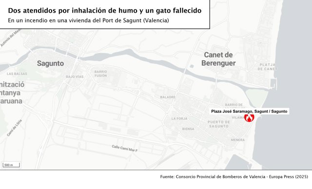 Dos hombres, de 24 y 52 años, han sido atendidos por inhalación de humo a causa de un incendio originado este viernes en una vivienda de la plaza José Saramago de Sagunt (Valencia). Igualmente, se ha localizado a un gato fallecido, según han informado Centro de Información y Coordinación de Urgencias (CICU) y el Consorcio Provincial de Bomberos de Valencia.