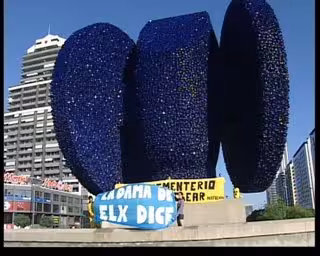 Así, pasadas las 9.30 horas, los ecologistas han colocado dos pancartas en la escultura de Manolo Valdés, situada en la rotonda de la Avenida de las Cortes Valencianas, en las que podía leerse: 'La dama d'Elx dice: No al cementerio nuclear', junto a varios bidones con el símbolo que advierte de presencia de material radiactivo.