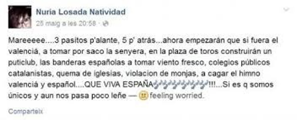 La concejal colgó un primer mensaje hace unos días en la red social donde textualmente apuntaba, tras los resultados de los comicios: "mareeee... 3 pasitos p'alante, 5 p'atrás... ahora empezará nque si fuera el valenciá (sic), a tomar por saco la senyera, en la plaza de toros construirán un puticlub, las banderas españolas a tomar viento fresco, colegios públicos catalanistas, quema de iglesias, violación de monjas, a cagar el himno valenciá y español....QUE VIVA ESPAÑA????????????!!!...Si es q somos únicos y aun nos pasa poco leñe....".