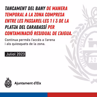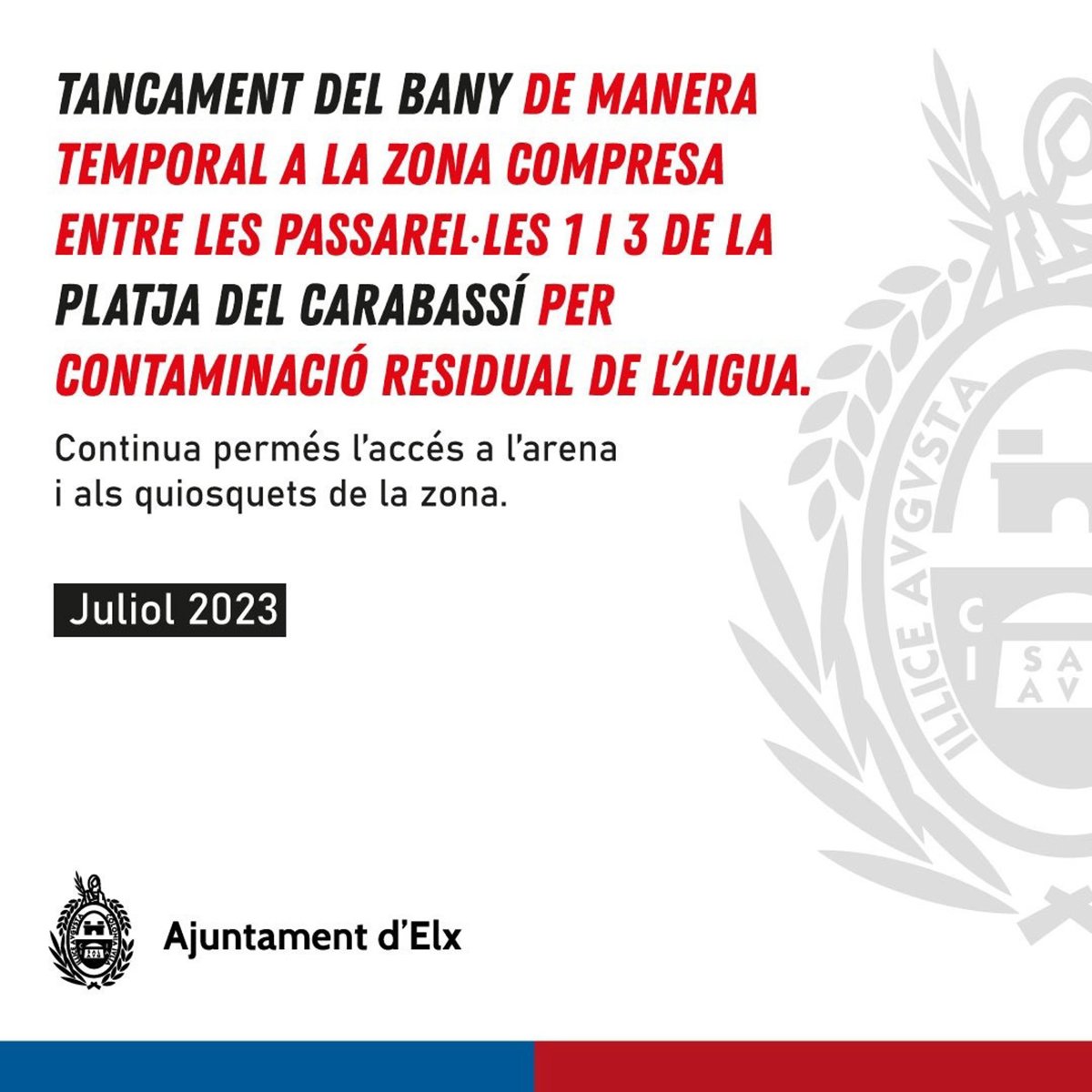 El Ayuntamiento de Elche (Alicante) ha cerrado al baño de forma temporal la zona entre las pasarelas 1 y 3 de la playa del Carabassí por contaminación residual del agua. No obstante, sí está permitido el acceso a la arena y los chiringuitos de la zona.