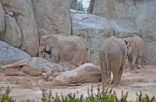 El espacio que recrea el bosque de Baobabs simboliza especialmente esta "alegría" con la que el grupo de elefantes ha recibido la lluvia. Los ocho elefantes disfrutaban de unos divertidos, lúdicos y nutritivos baños de lodo.