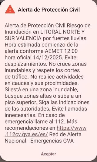 El Centro de Coordinación de Emergencias de la Generalitat, ante los avisos de nivel rojo por lluvias comunicados por la Agencia Estatal de Meteorología (Aemet), ha enviado un mensaje Es-Alert a los móviles del litoral norte de Castellón y el litoral de Valencia.