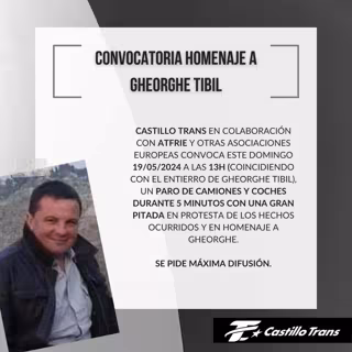 La empresa alicantina Castillo Trans ha convocado este domingo 19 de mayo un paro y pitada de cinco minutos, en protesta por la muerte del camionero Gheorghe Tibil, que falleció tras recibir el lanzamiento de una tapa de alcantarillado desde un puente en Bélgica mientras conducía.