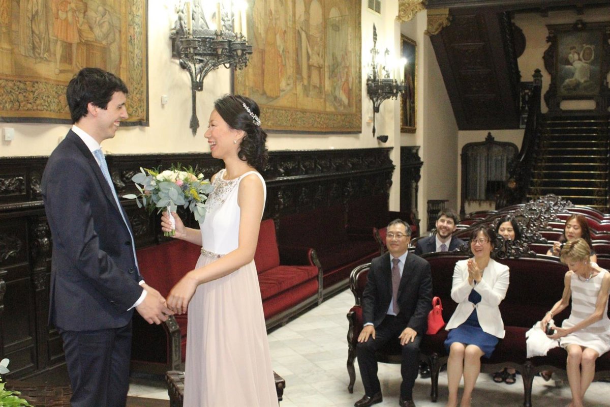 El Salón de la Reina del Colegio Notarial de Valencia ha sido el lugar elegido por la pareja de novios Guillermo Soler y Yein Lee, valenciano y coreana, respectivamente, para celebrar su boda, la primera ante notario.