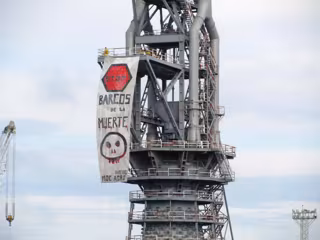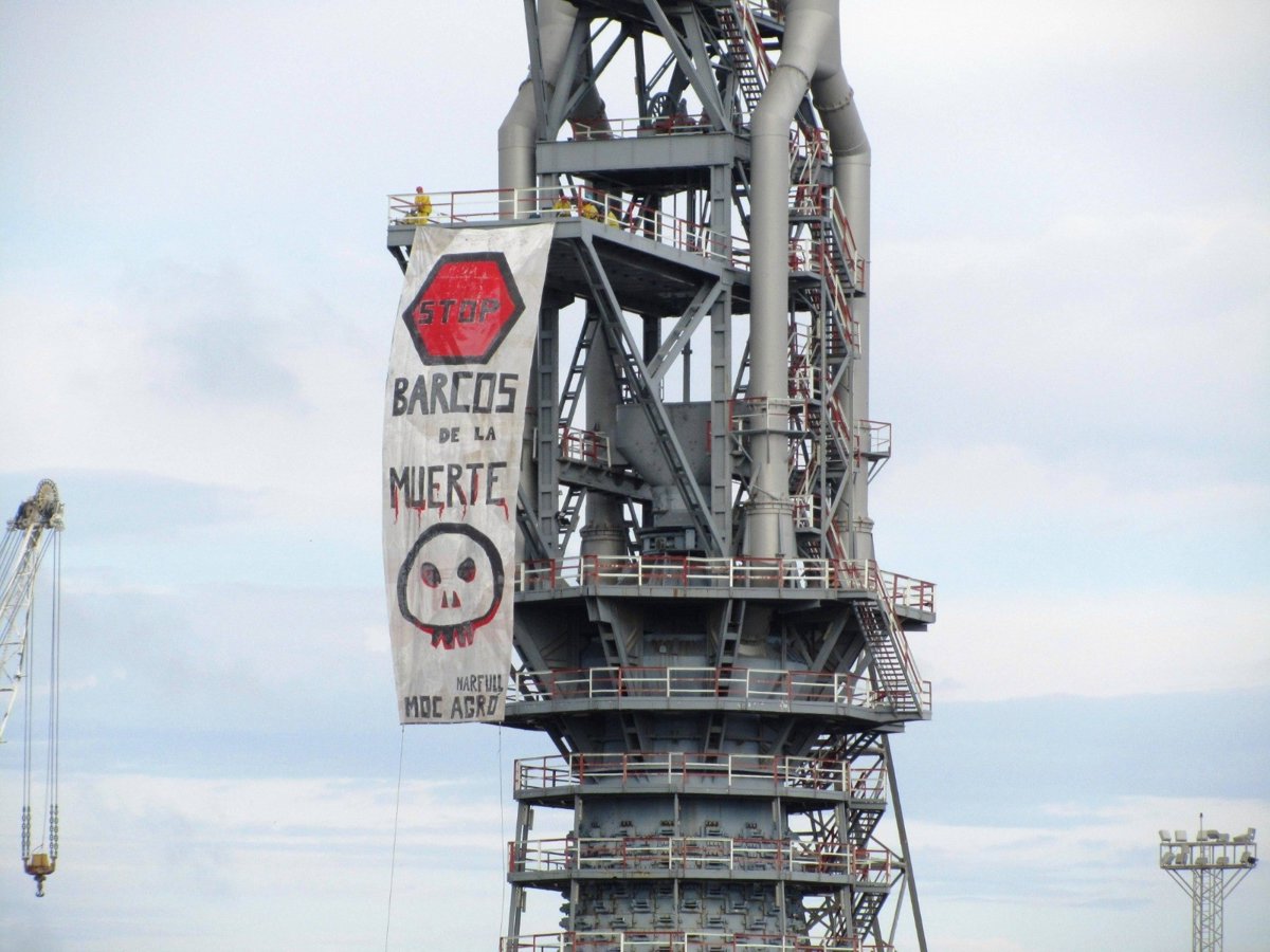 Miembros de Marfull-Acció Ecologista Agró y de Antimilitaristes-MOC accedieron al Alto Horno monumental, anexo al recinto portuario, para desplegar una pancarta gigante en la que se podía leer 'STOP Barcos de la muerte'. "La acción se desarrolló con tranquilidad y sin incidentes", han señalado las mismas fuentes.