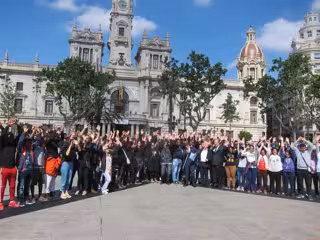 Miembros, responsables y beneficiarios de entidades sociales de la Comunitat Valenciana, agrupadas bajo la Plataforma del Tercer Sector, y de las ONGs de cooperación al desarrollo que integran la Coordinadora Valenciana de ONGD han trazado este lunes una x gigante y humana en la Plaza del Ayuntamiento de València para animar a los contribuyentes de esta autonomía a marcar en su declaración de la Renta la casilla 106, la destinada a Actividades de Interés Social.