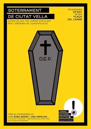 El "entierro", bajo el lema 'Vecinos/as en peligro de extinción', ha sido promovido por la asociación de vecinos de Ciutat Vella, además de las entidades vecinales Amics del Carme, La Boatella, El Palleter, Ciutat Vella Batega, Col·lectiu de Mares i Pares, Escoltem Velluters, Endavant, Plataforma de la Muralla, El Punt, Asamblea Okupa de Ciutat Vella, y cuenta con el apoyo de la red EntreBarris.