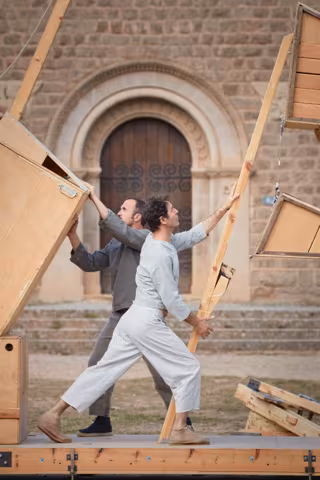 Coreografiar una acción cotidiana como el montaje de una escenografía se convierte en el propio espectáculo, donde la artesanía juega un papel imprescindible convirtiéndose en protagonista principal, huyendo de materiales y herramientas inteligentes para no limitar su eficacia como artesano, a medio camino entre el conocimiento y la intuición.