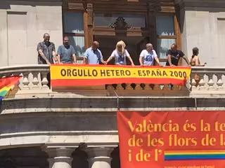 Miembros de España 2000 han colgado este viernes del balcón del edificio del Ayuntamiento de Valncia una pancarta con la bandera de España y el lema 'Orgullo Hetero', que ha permanecido durante unos segundos en la fachada de la casa consistorial por encima de la pancarta que la corporación municipal ha colocado con motivo del Día del Orgullo LGTBI, según han informado a Europa Press fuentes municipales.
