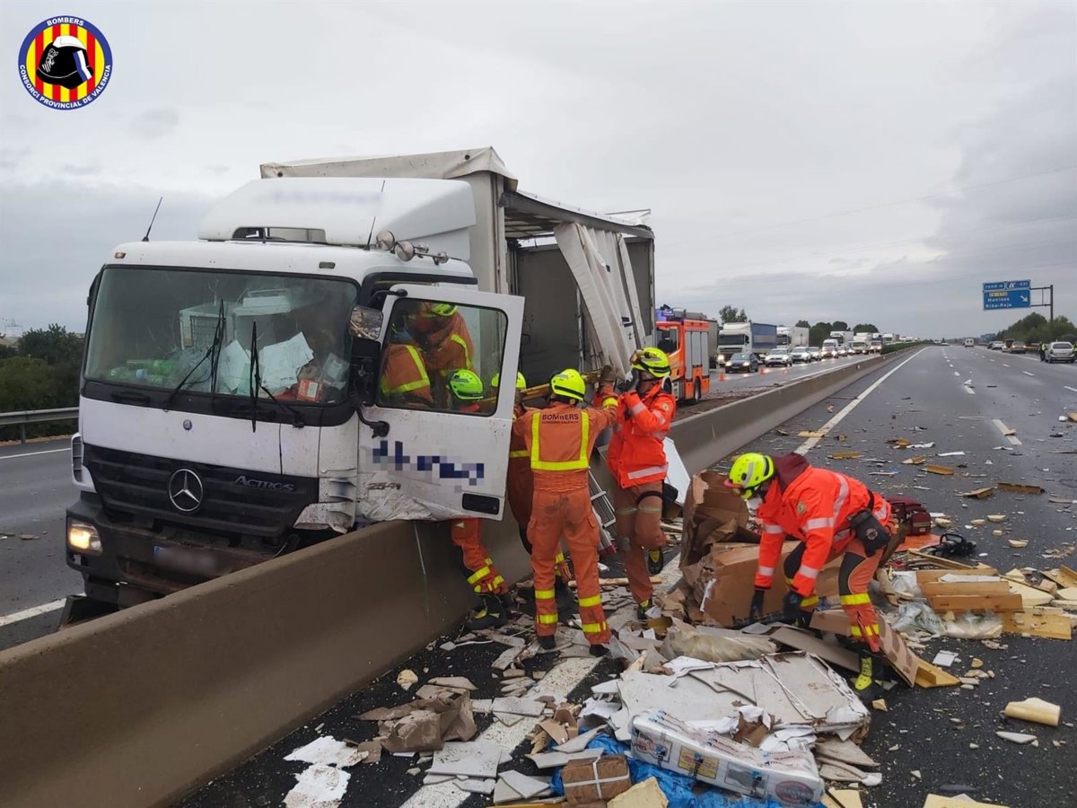 Efectivos sanitarios han estabilizado a un hombre de 38 años en un accidente de camión que transportaba azulejos este martes en la A-7 a su paso por Riba-roja de Túria (Valencia), según ha informado el Centro de Información y Coordinación de Urgencias (CICU).