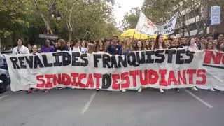 La marcha ha salido poco después de las 12.00 horas de la Facultad de Geografía e Historia de la avenida Blasco Ibáñez de la capital del Turia y reúne a un gran número de alumnos, muchos de ellos muy jóvenes. El recorrido está encabezado por una pancarta del Sindicato de Estudiantes con el lema 'Reválidas franquistas No¡'.
