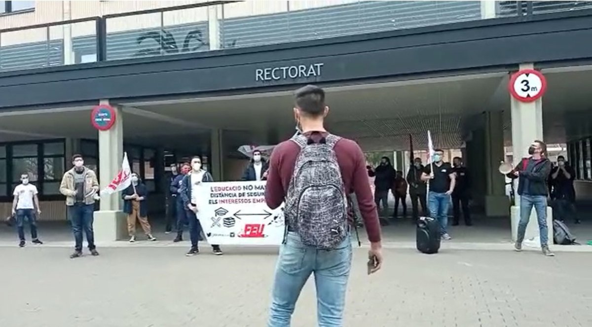 A las 11.30 horas han llevado a cabo una concentración ante el edificio del rectorado con una pancarta en la que se podía leer 'La educación no mantiene la distancia de seguridad con los intereses empresariales'. Posteriormente, han entrado en el edificio haciendo ruido con sartenes y cacerolas pidiendo hablar con el rector y, más tarde, han continuado reclamando fuera del rectorado ser atendidos por el máximo responsable de la universidad.