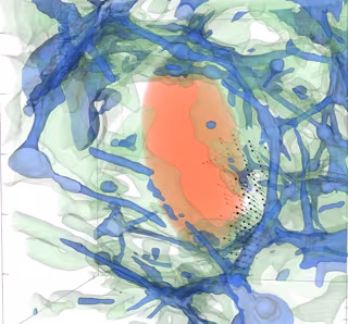 Representación tridimensional de un volumen del universo en la cual se aprecia cómo la distribución de materia formada por filamentos y cúmulos de galaxias (de color azul y verde) rodea a un vacío cósmico (en color rojo). - UV