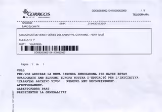 "Quiero hacerles llegar mi sincera enhorabuena por haber sido galardonados con los premios Europa Nostra de Educación por la iniciativa Cabanyal Archivo Vivo. Recibid mi reconocimiento. Afectuosamente", indica el 'president' en el telegrama.