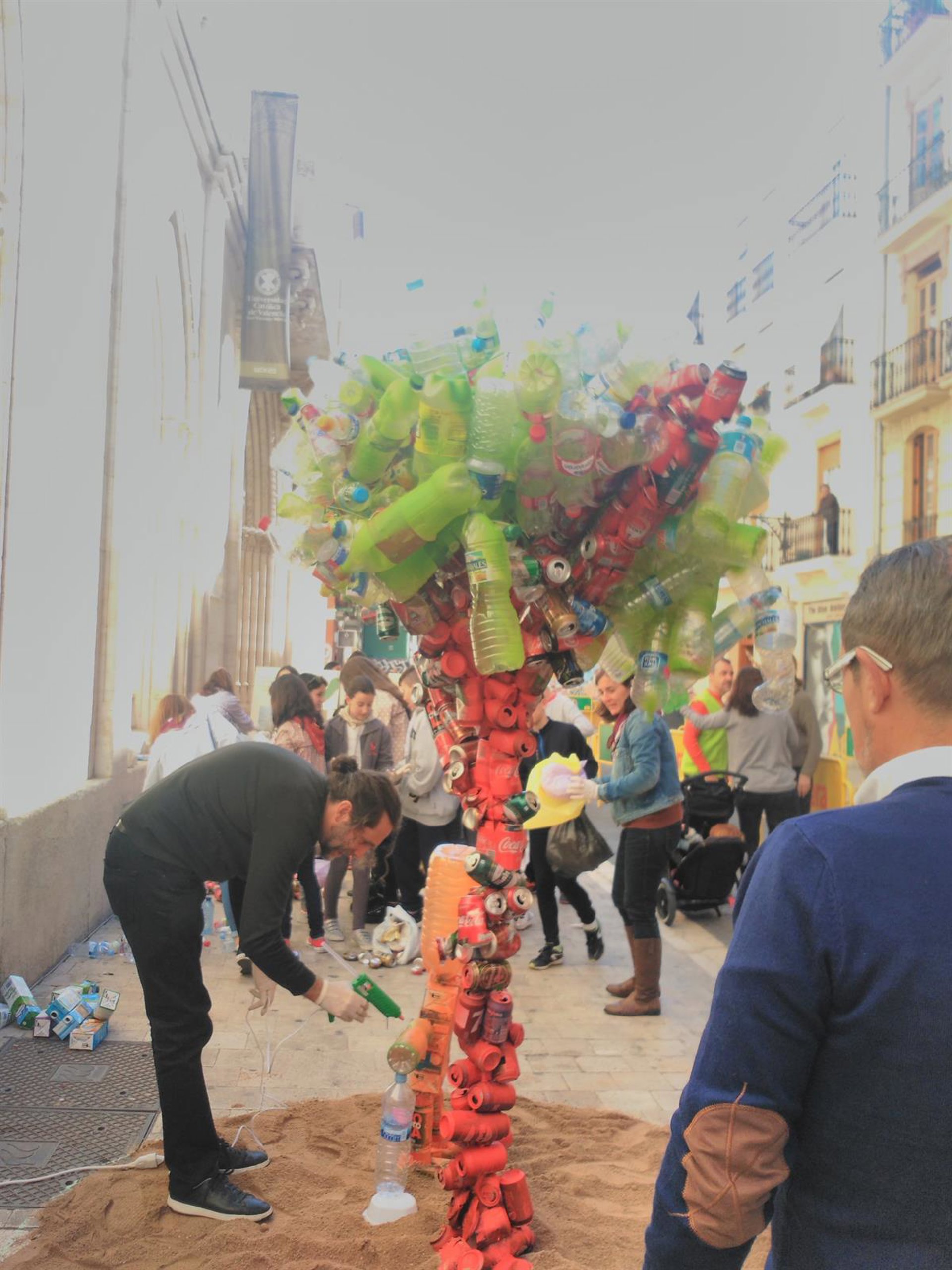 La obra, perteneciente a la falla Mossén Sorell-Corona de València, ha sido creada por Ibán Tramón, uno de los integrantes de la comisión, con motivo de las fiestas josefinas. Se trata de un árbol compuesto de botellas y latas recogidas en las calles de València.